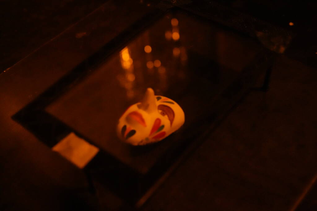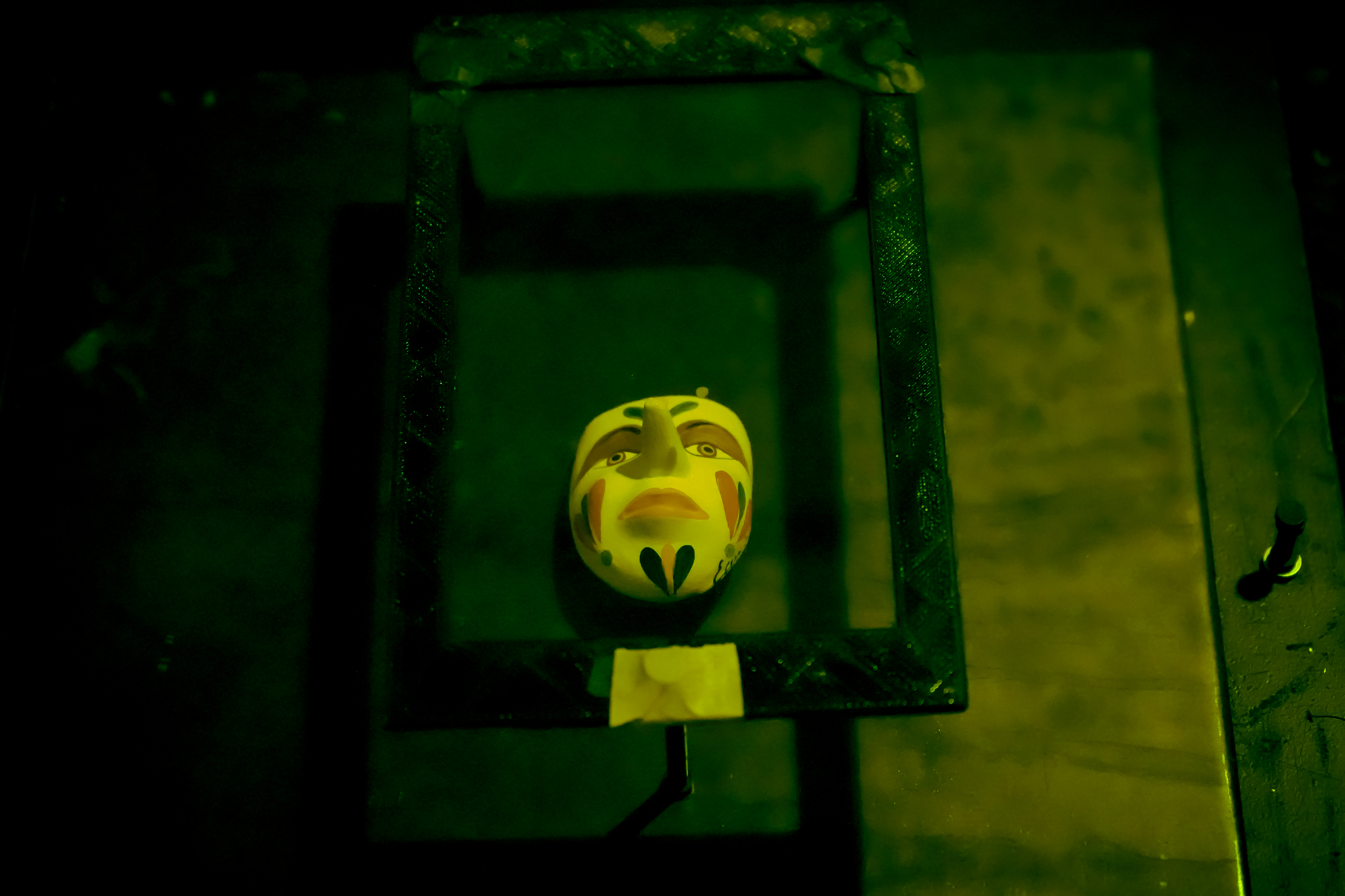 This specific mask is the artisan’s own interpretation—produced for sale in the craft market—yet it carries the visual language of celebration, performance, and ceremonial identity. By bringing it into holography, I shift it from an object of commerce and tradition into a perceptual presence: a light-record that can be revisited from multiple angles, where depth, absence, and apparition become part of how the mask is “read.”